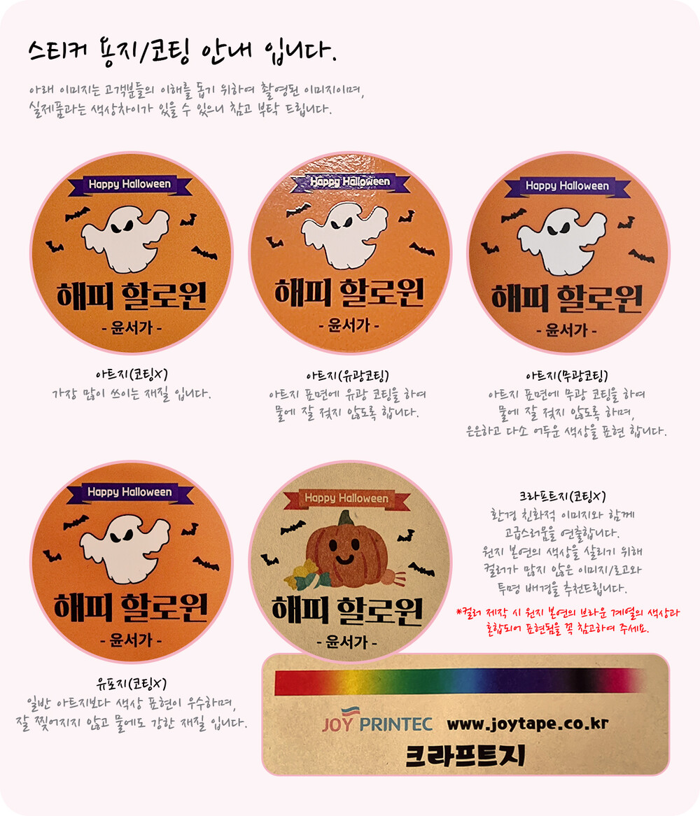 - 크라프트지의 경우, 종이 본연의 색상이 있어 스티커 이미지의 색상에 따라 종이 색상과 혼합되어 색상이 달라지게 됩니다.