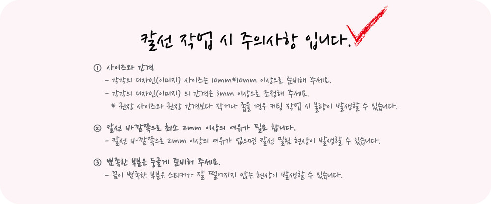 - 스티커를 떼어낼 수 있는 칼선 공정 상 칼선 모양대로 용지 일부가 잘리는 경우가 발생할 수 있습니다.