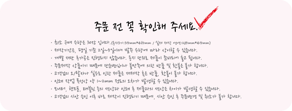 - 개별 재단 후가공은 진행되지 않습니다. 용지 단위로 제품이 준비되어 출고 됩니다.