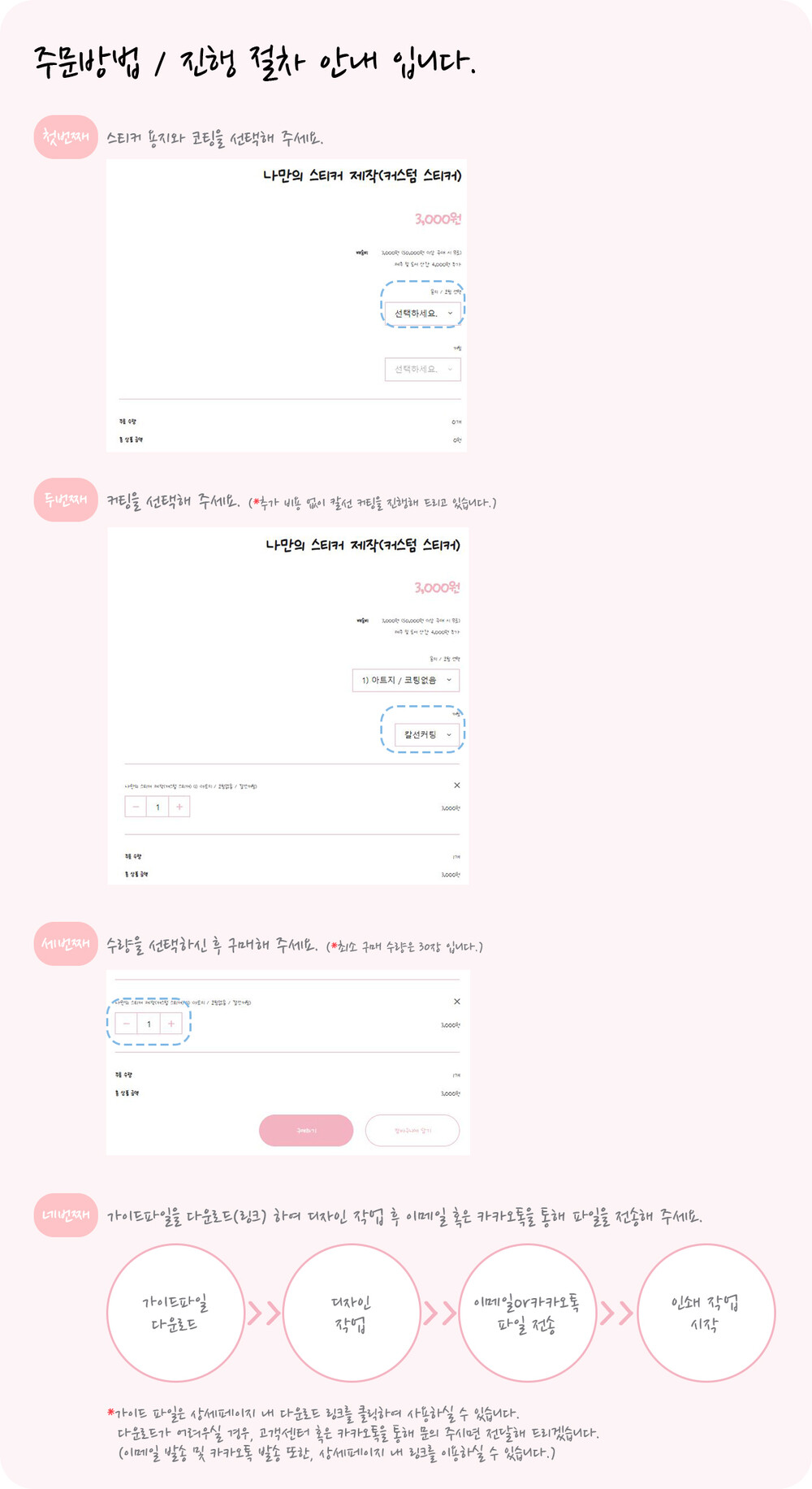 - 스티커 주문 수량은 용지(315mm*465mm) 한 장 단위 입니다. (*최소 구매 수량은 30장 입니다.)