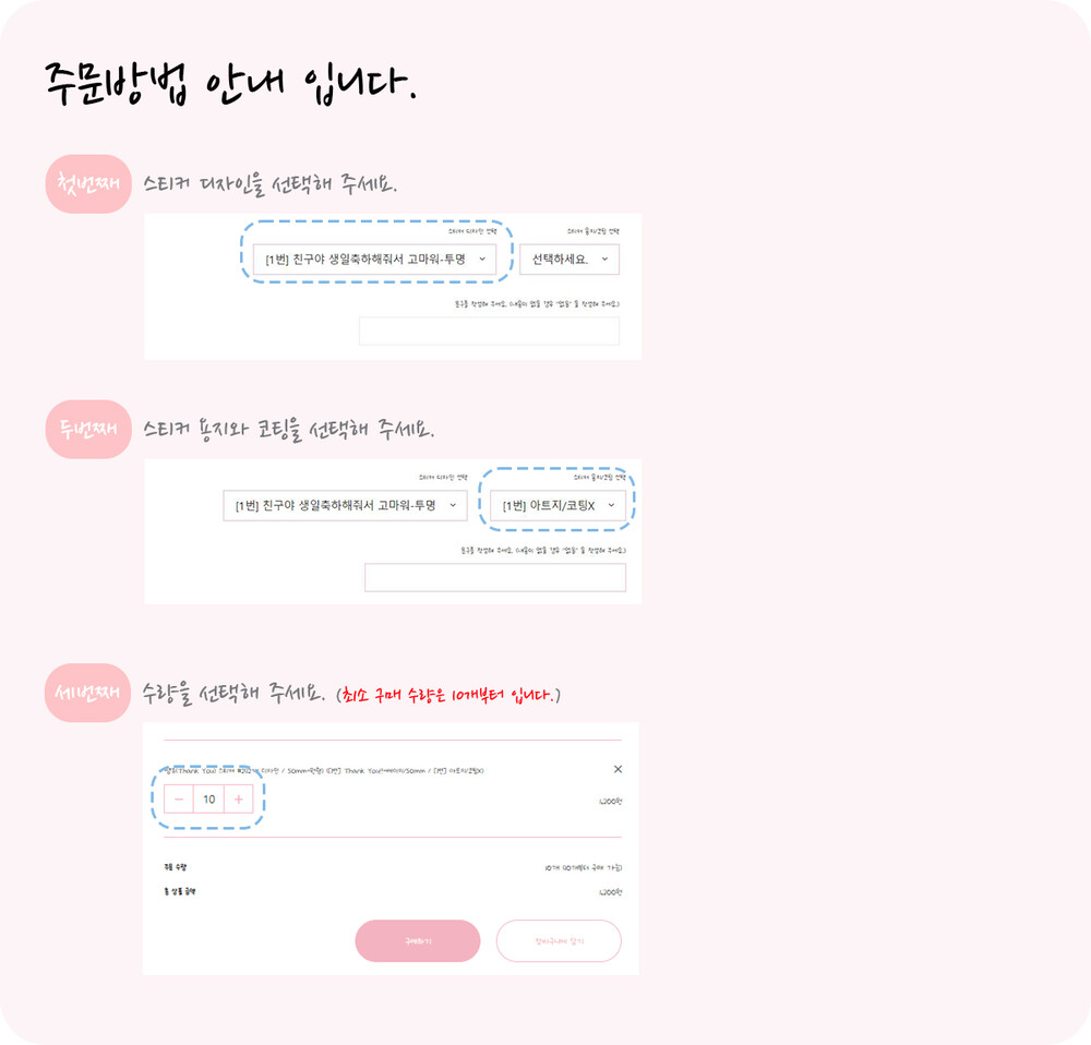 - 스티커 주문 수량은 10개 입니다.