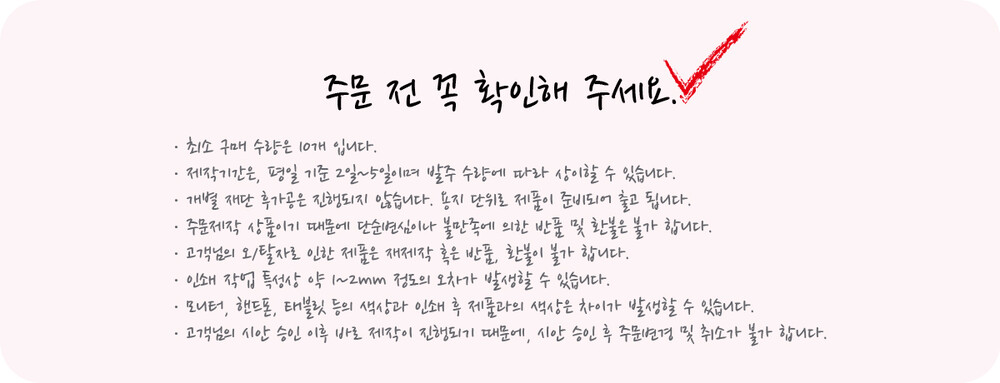 - 주문 시 연락처 혹은 이메일 주소를 꼭 남겨 주셔야 시안 확인이 가능 합니다.
